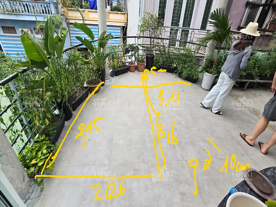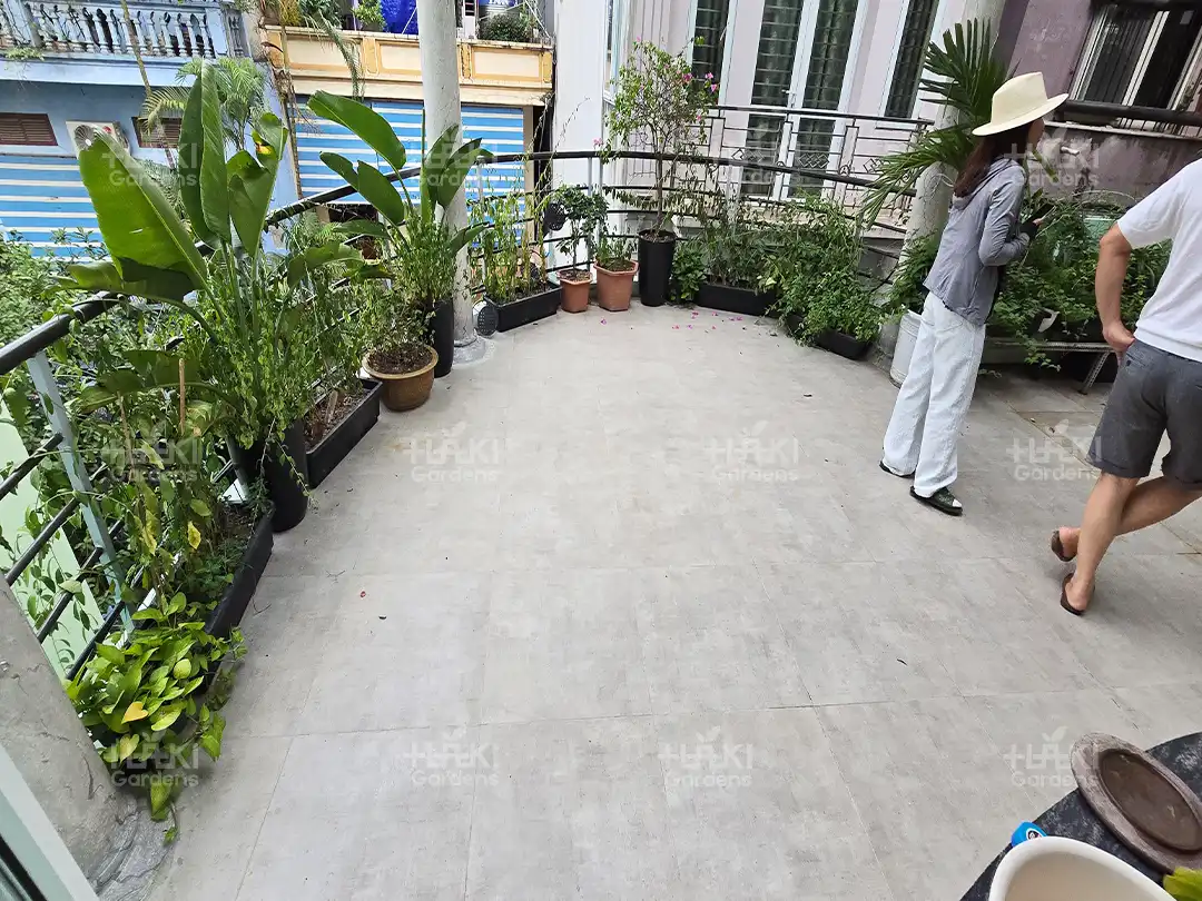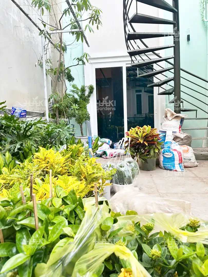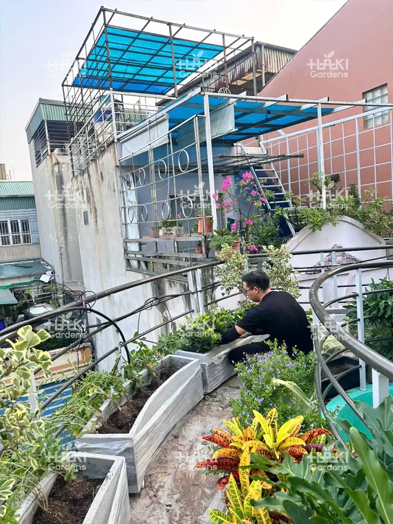 Thi công tại nhà anh Hùng là một thử thách thú vị đối với đội ngũ Haki. Với địa hình đặc trưng – ban công cao, hẹp và không thể sử dụng máy cẩu – toàn bộ vật tư, cây cảnh và chậu xi măng đều được vận chuyển thủ công bằng sức người. Dù thời tiết không thuận lợi, sáng nắng gắt, tối mưa to, đội ngũ kỹ thuật viên vẫn nỗ lực hết mình để:
