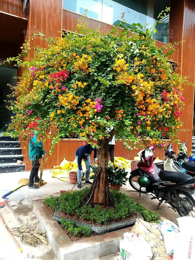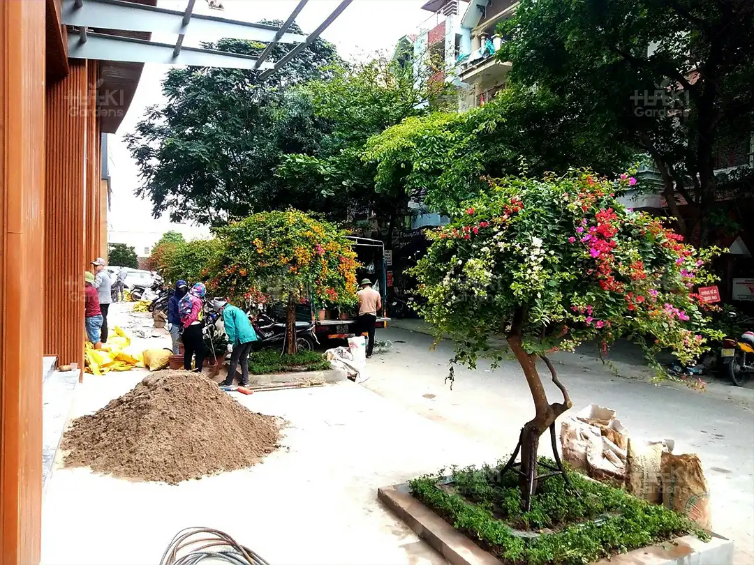 Hoàn tất công tác chuẩn bị, chúng ta đến với khâu thi công. Đây là bước vô cùng quan trọng, ngoài việc phải chuẩn bị tốt thì việc thi công cũng yêu cầu KTV có trình độ và kinh nghiệm. Vì trồng cây làm sao để cây có thể sống được và căn góc độ của cây để có thể toát lên vẻ đẹp của hoa giấy.