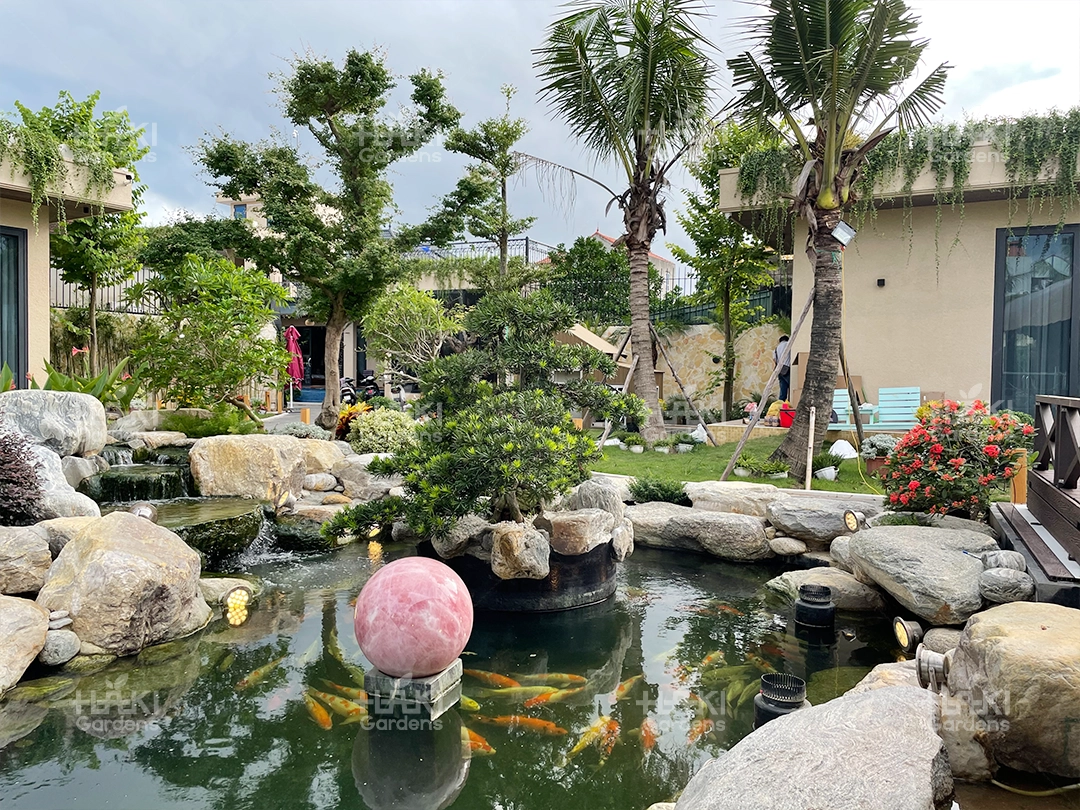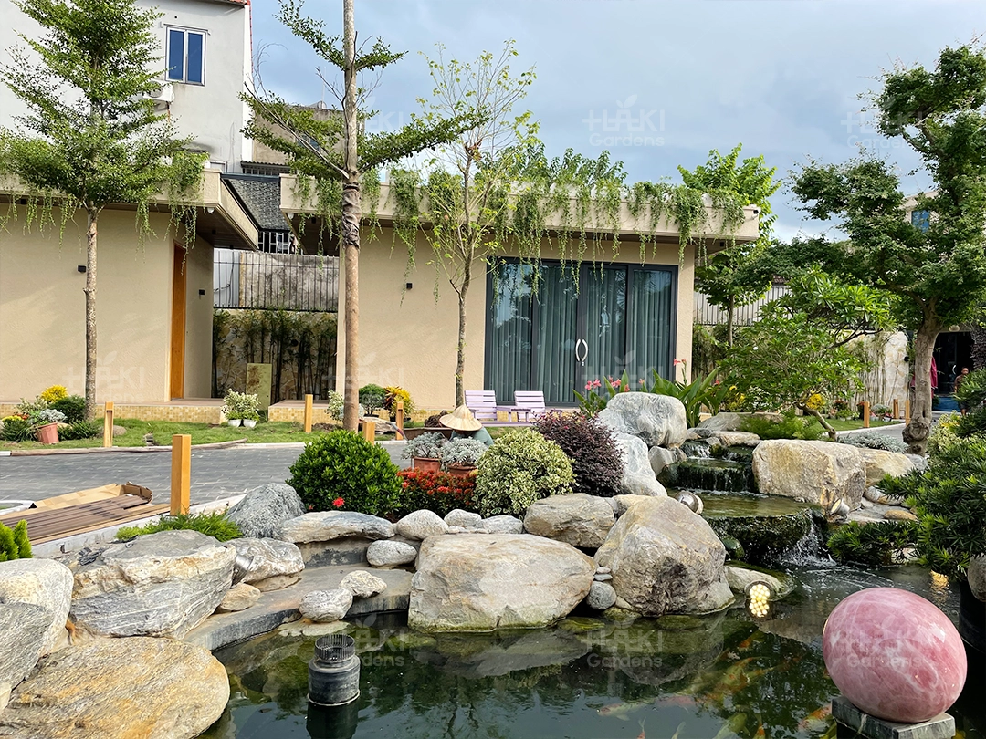 Trang trí tiểu cảnh: Kết hợp đá dăm với các loại cây cảnh, hồ cá tạo nên những tiểu cảnh sinh động.
