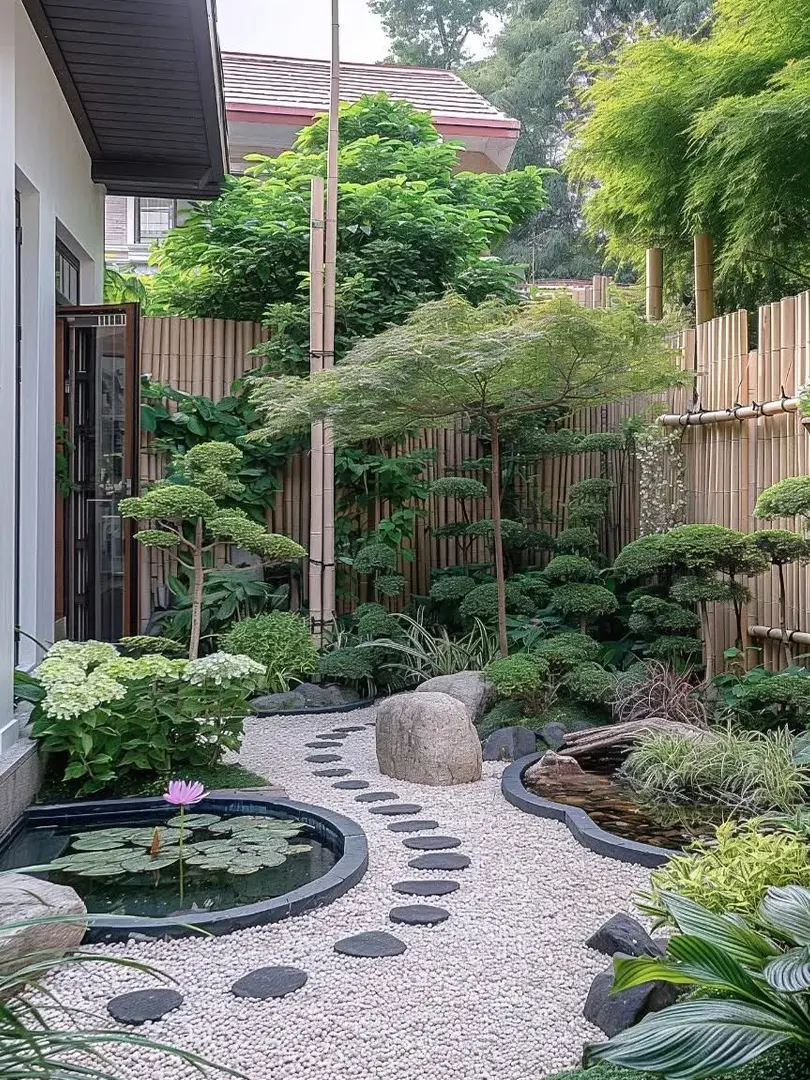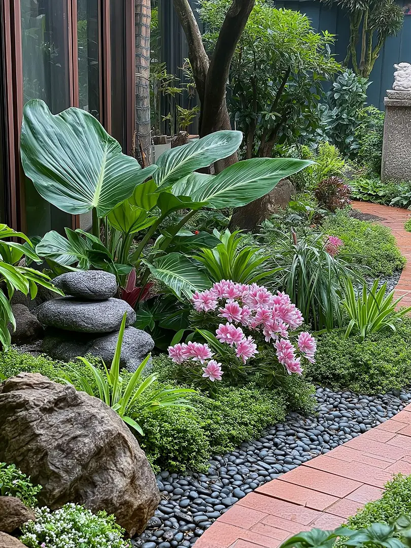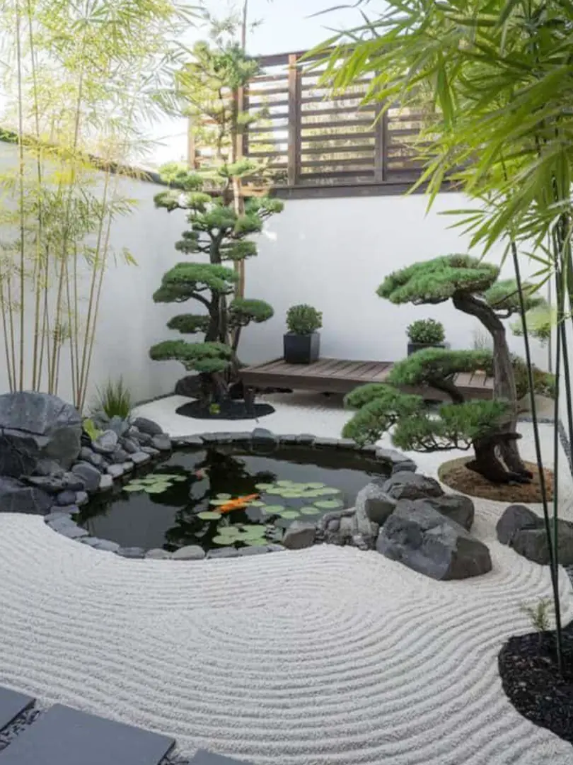 Kết hợp màu sắc hài hòa: Giữa đá, cây xanh, nước và các vật liệu khác.