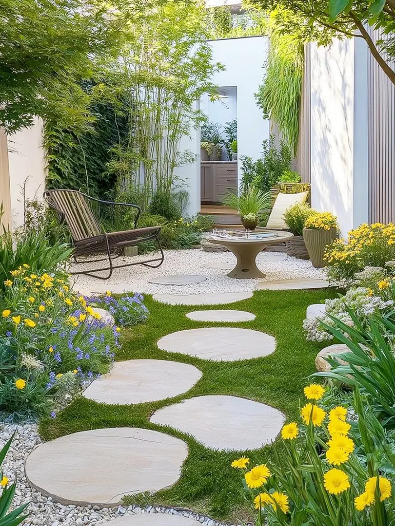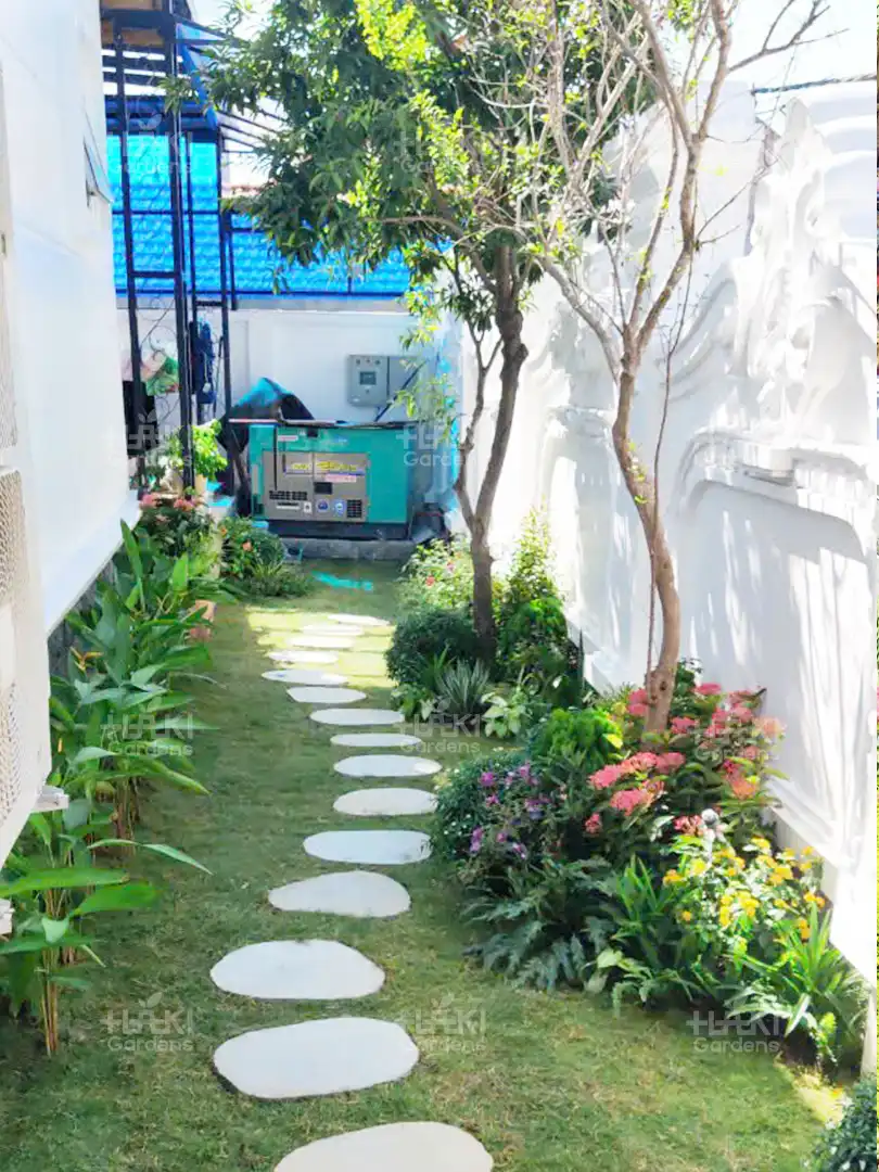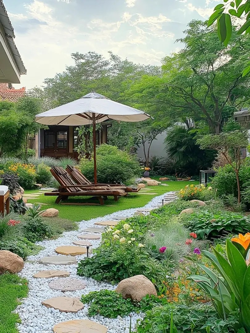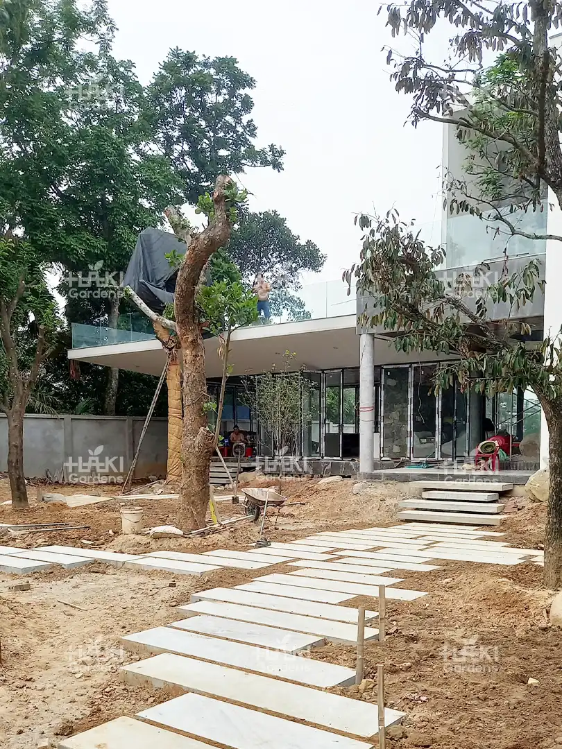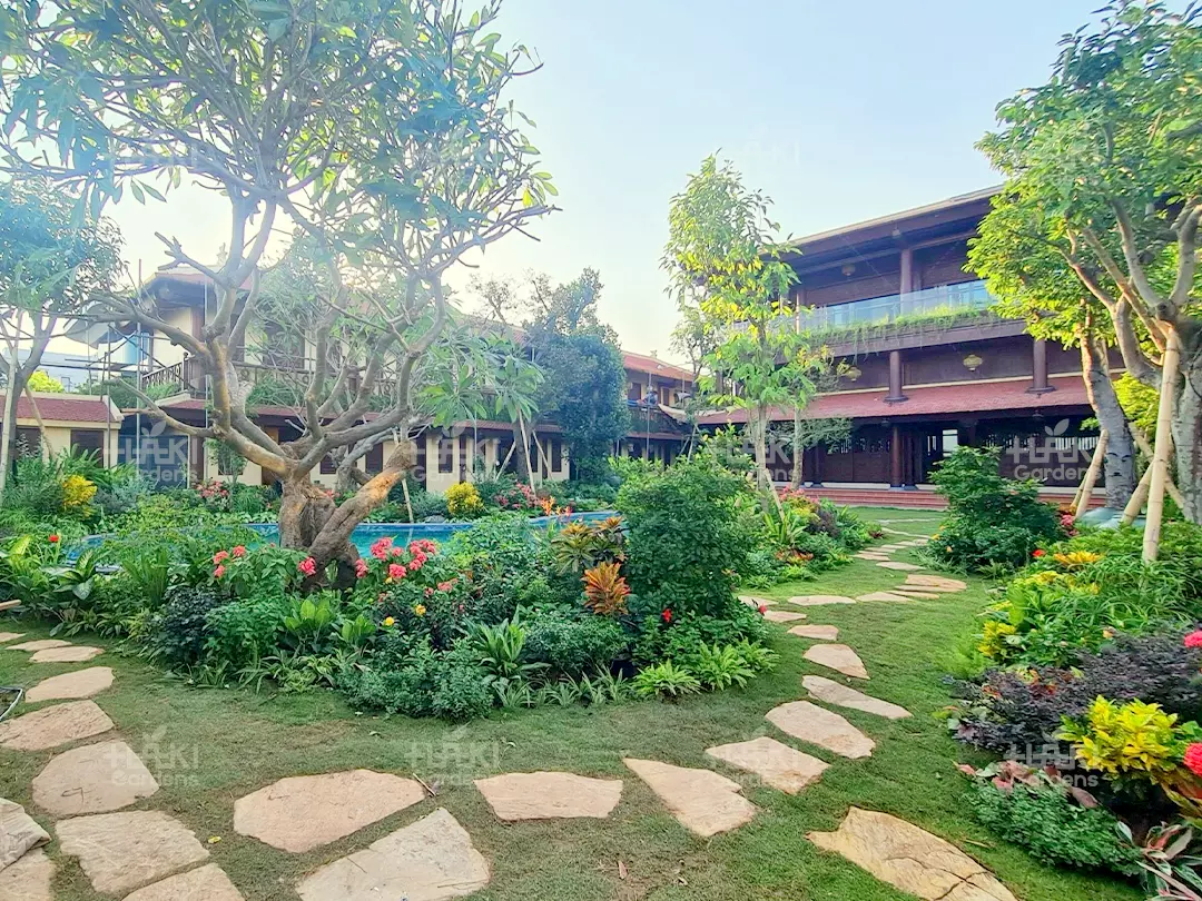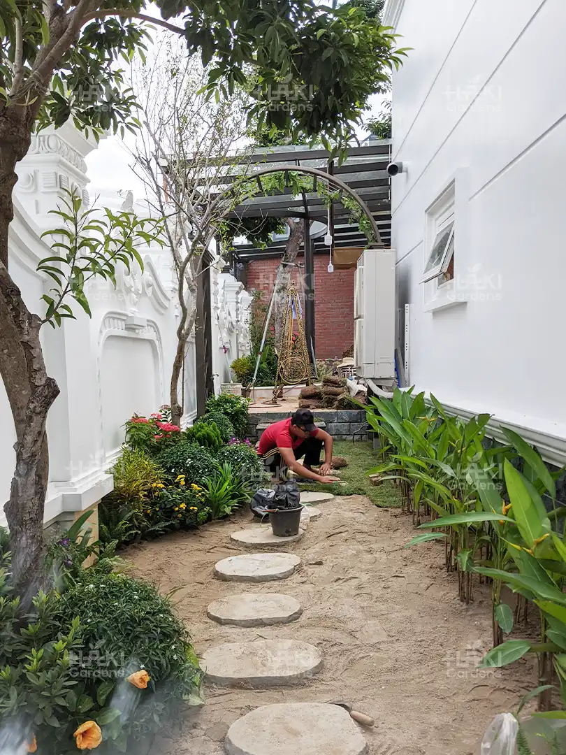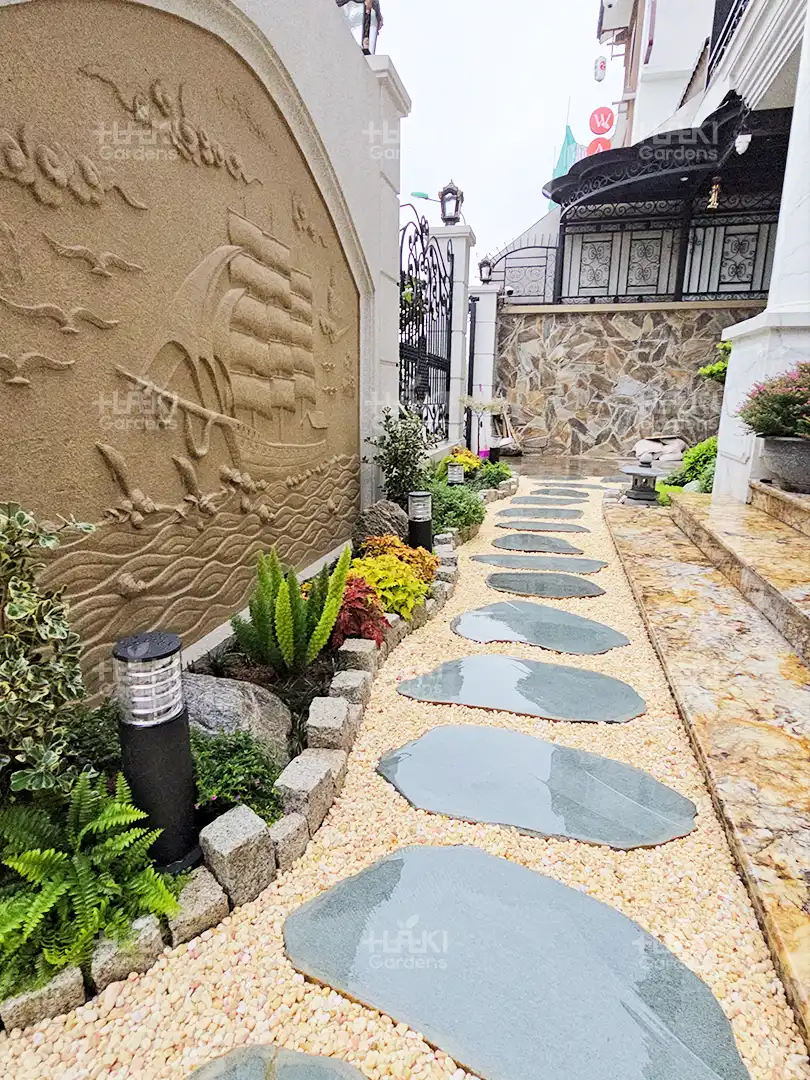 Lát lối đi: Những viên đá cuội được sắp xếp khéo léo tạo nên lối đi mềm mại, uốn lượn giữa khu vườn, vừa đảm bảo độ bền vừa tăng tính thẩm mỹ.