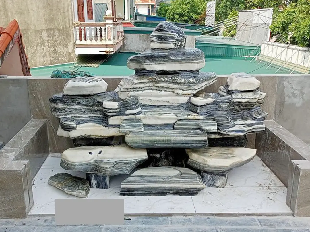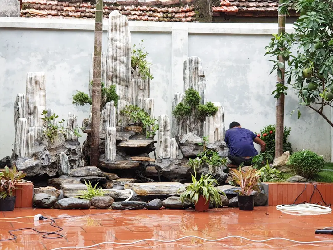 Tiểu cảnh nước – thác nước: Khi kết hợp với dòng chảy, vân đá tạo hiệu ứng chuyển động nhẹ nhàng, tăng tính nghệ thuật cho công trình.